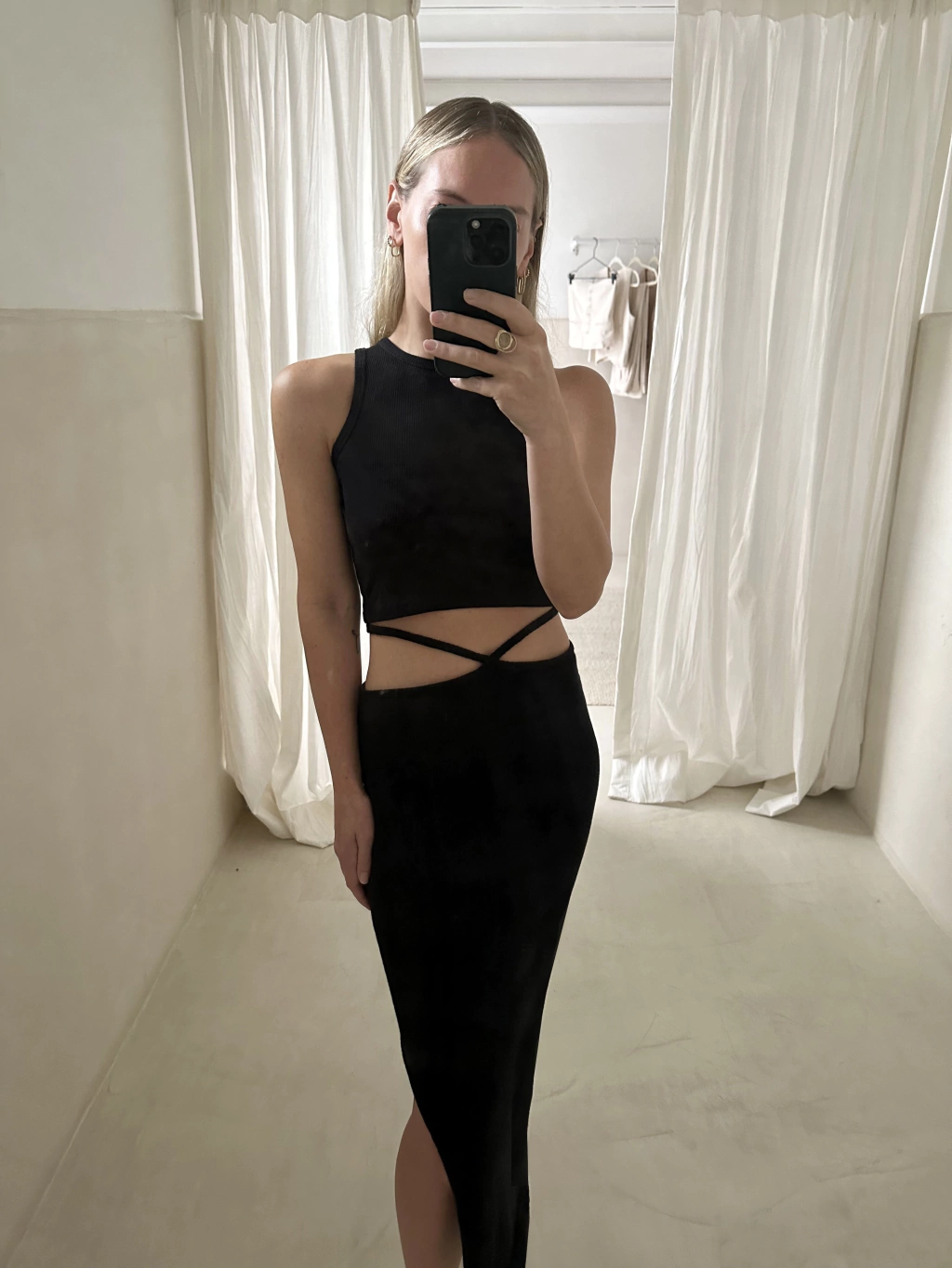 Falda con tejida a mano en Algodón 100% con dos tiras en cruz en la cintura que se atan en la espalda y dos tajos laterales.