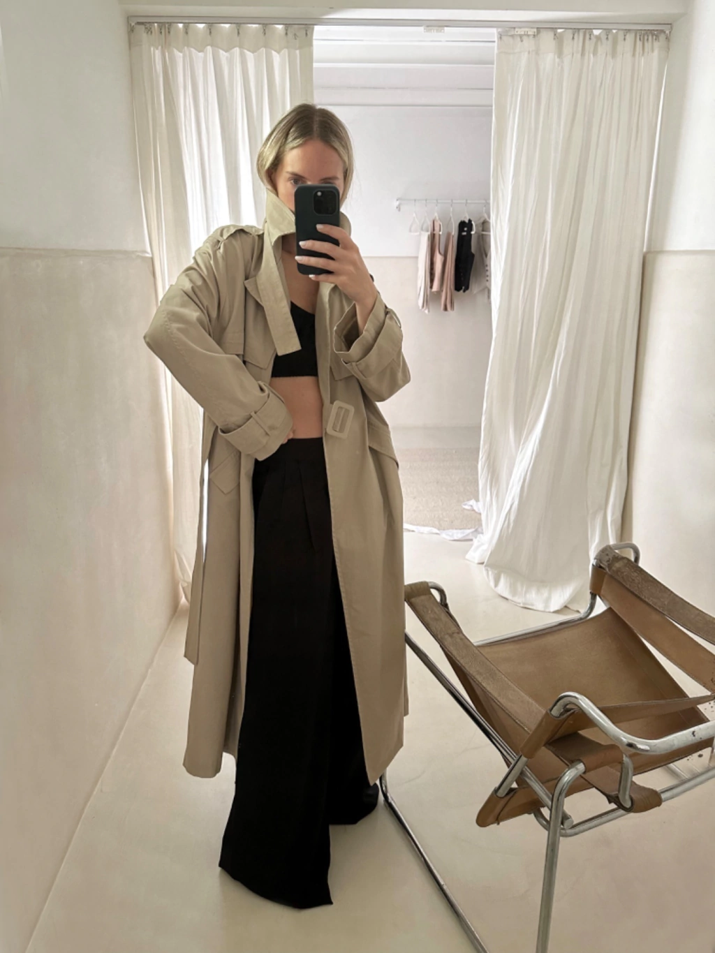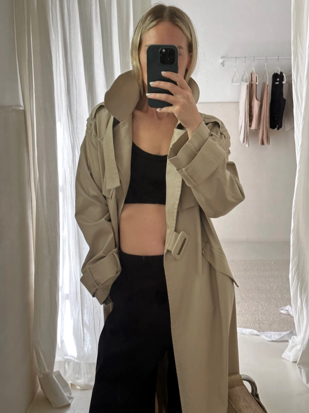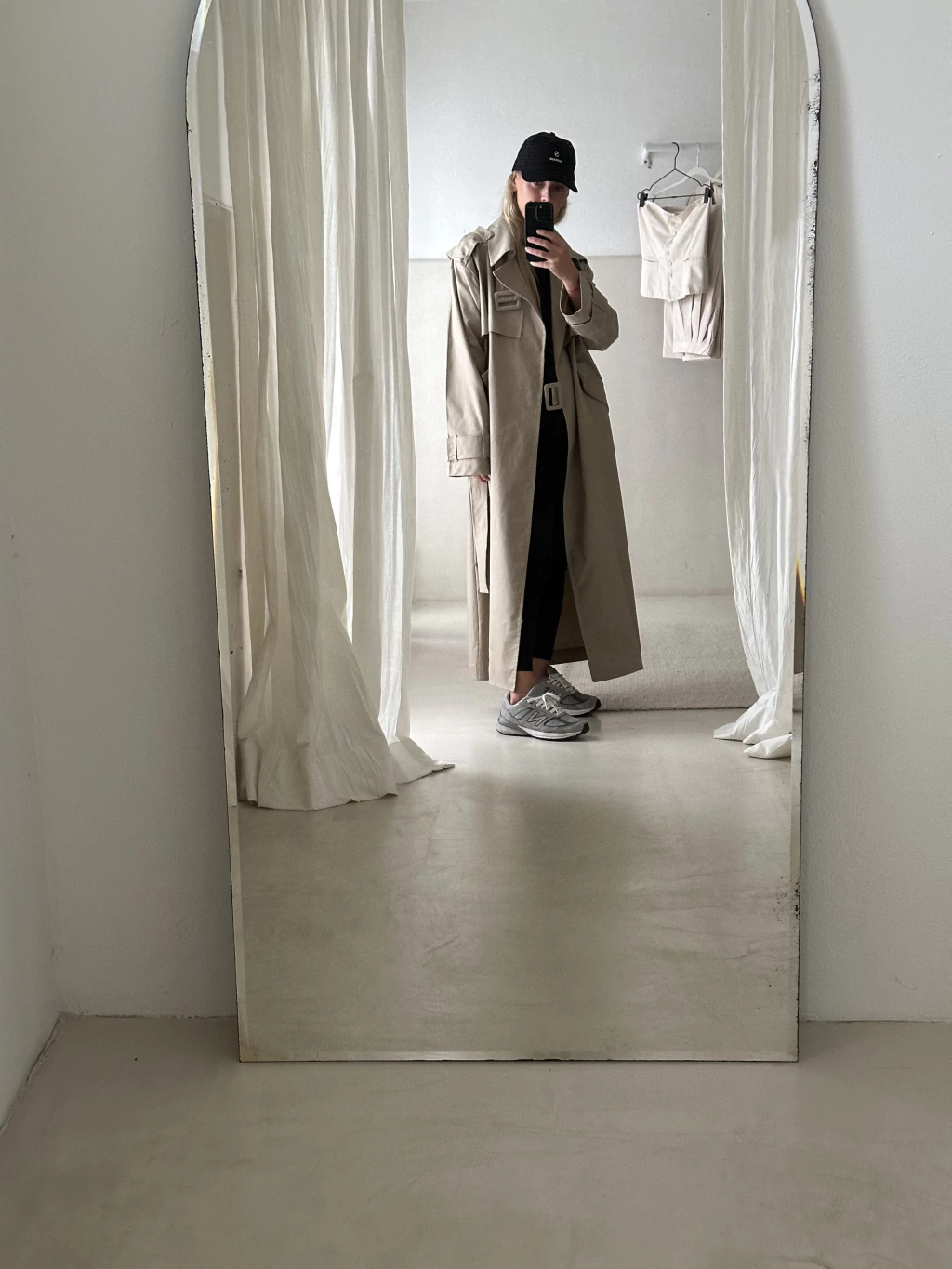Trench oversized realizado en Gabardina de 97% Algodón 3% Spandex de la más alta calidad. Prenda básica y atemporal, super versátil para usar en invierno o verano. No es impermeable.